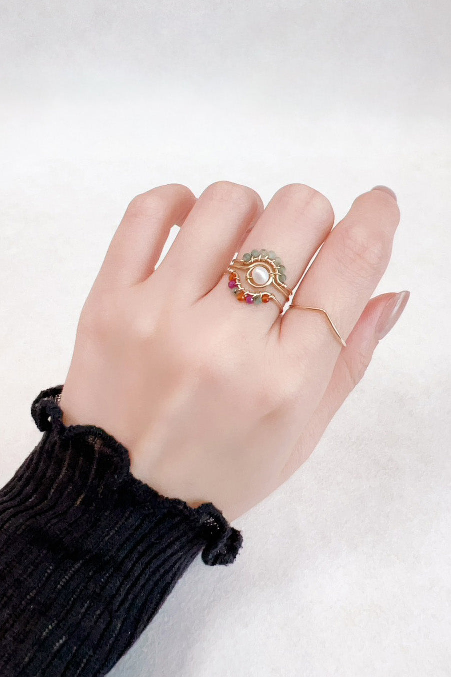天然寶石以放射狀排列組合,猶如孔雀羽翼般綻放,璀璨的光芒在指尖舞動,微笑曲線的設計,恰如其分地演繹著柔美的流線,無論是與單顆寶石戒指還是玫瑰戒指搭配,都能巧妙融合,為手指增添一抹獨特的光彩與柔情。