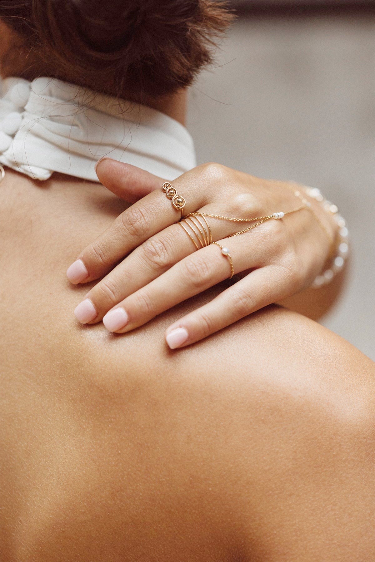 Amélia戒指,巧妙地鑲嵌著不同大小的光滑金珠,彷彿星辰般點綴在指間。
