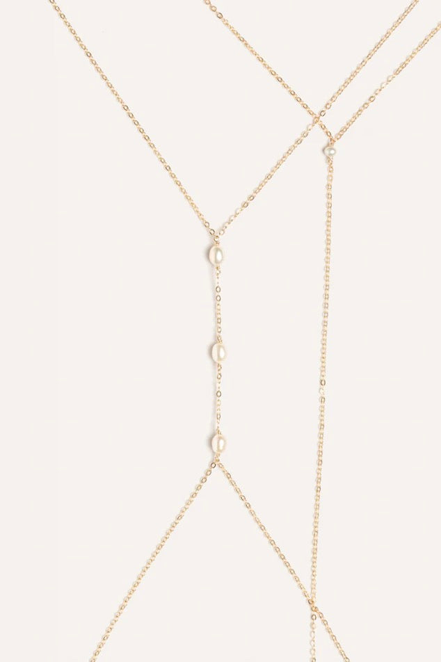 身體珠寶以女性化且大膽的設計風格裝飾身體,鍊條緊貼曲線,巧妙地凸顯出每一寸身材線條,為身形增添獨特魅力。珠寶正面鑲嵌三顆米粒形的天然珍珠,柔和的光澤勾勒出優美的身體曲線,完美映襯您的自然美。頸背處則鑲嵌一顆小珍珠,為整體設計增添一抹精緻的呼應。