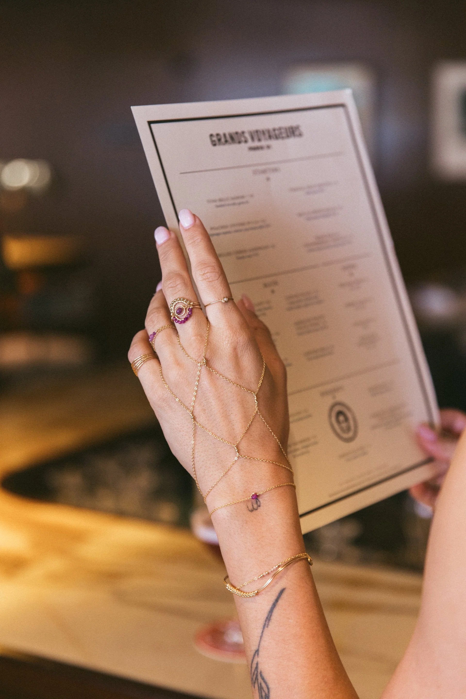 設計師巧妙地將寶石與金線纏繞在一起,並固定在精緻的鏈條上,配戴在手腕處增添一抹柔美與現代感。