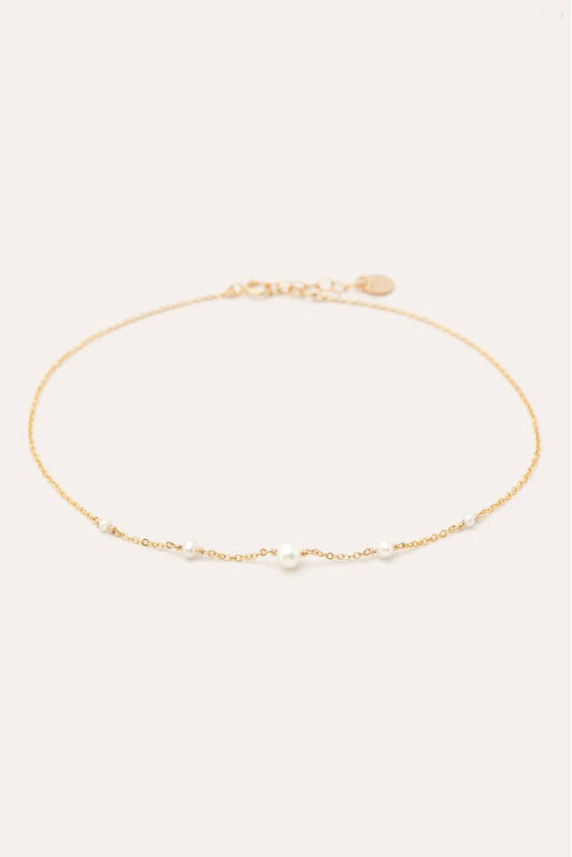 Chance 腳鍊由五顆天然珍珠組成,鑲嵌在細鏈上,由大至小的排列能修飾腳踝線條。