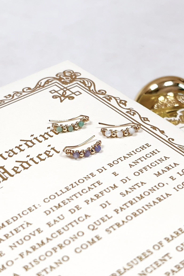 靈感源自大自然中攀緣莖的柔韌曲線,以金線手工編織細緻金珠與祖母綠寶石,展現出宛如植物沿耳垂盤旋生長的動感結構。
