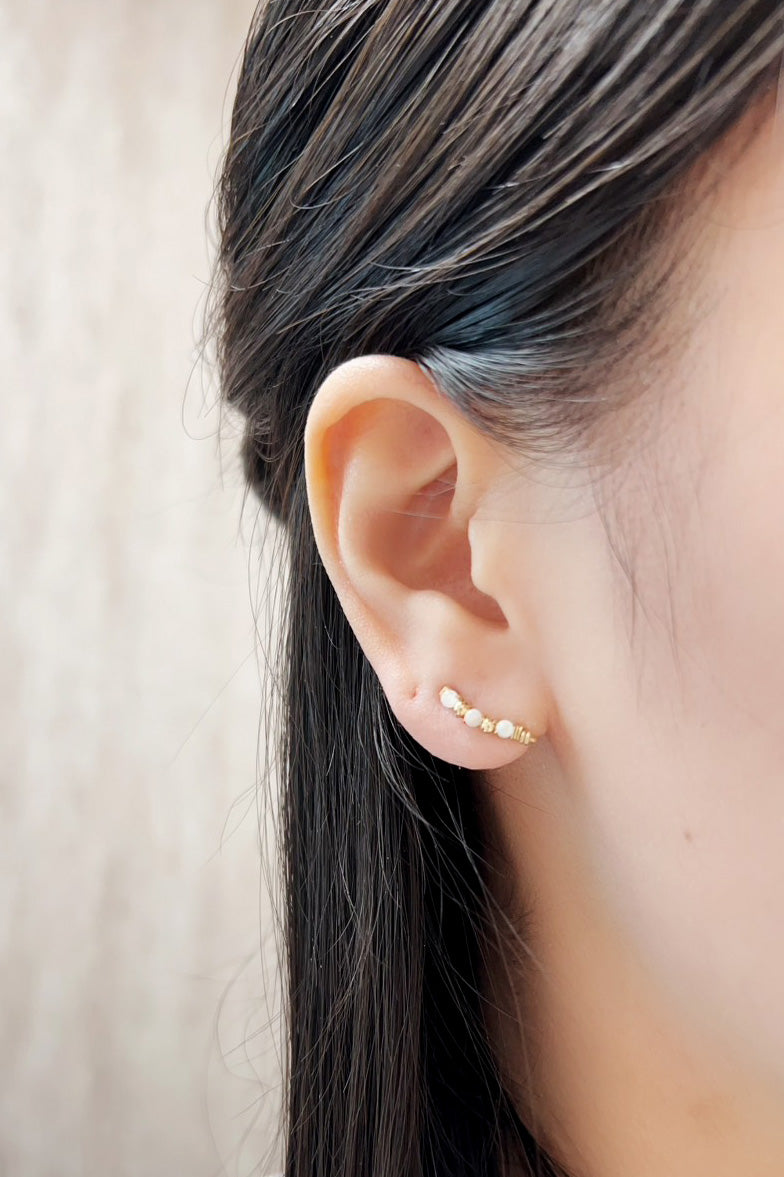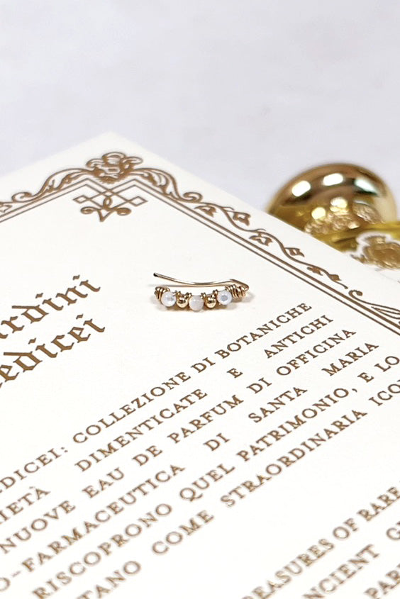 靈感源自大自然中攀緣莖的柔韌曲線,以金線手工編織細緻金珠與珍珠母貝,展現出宛如植物沿耳垂盤旋生長的動感結構。