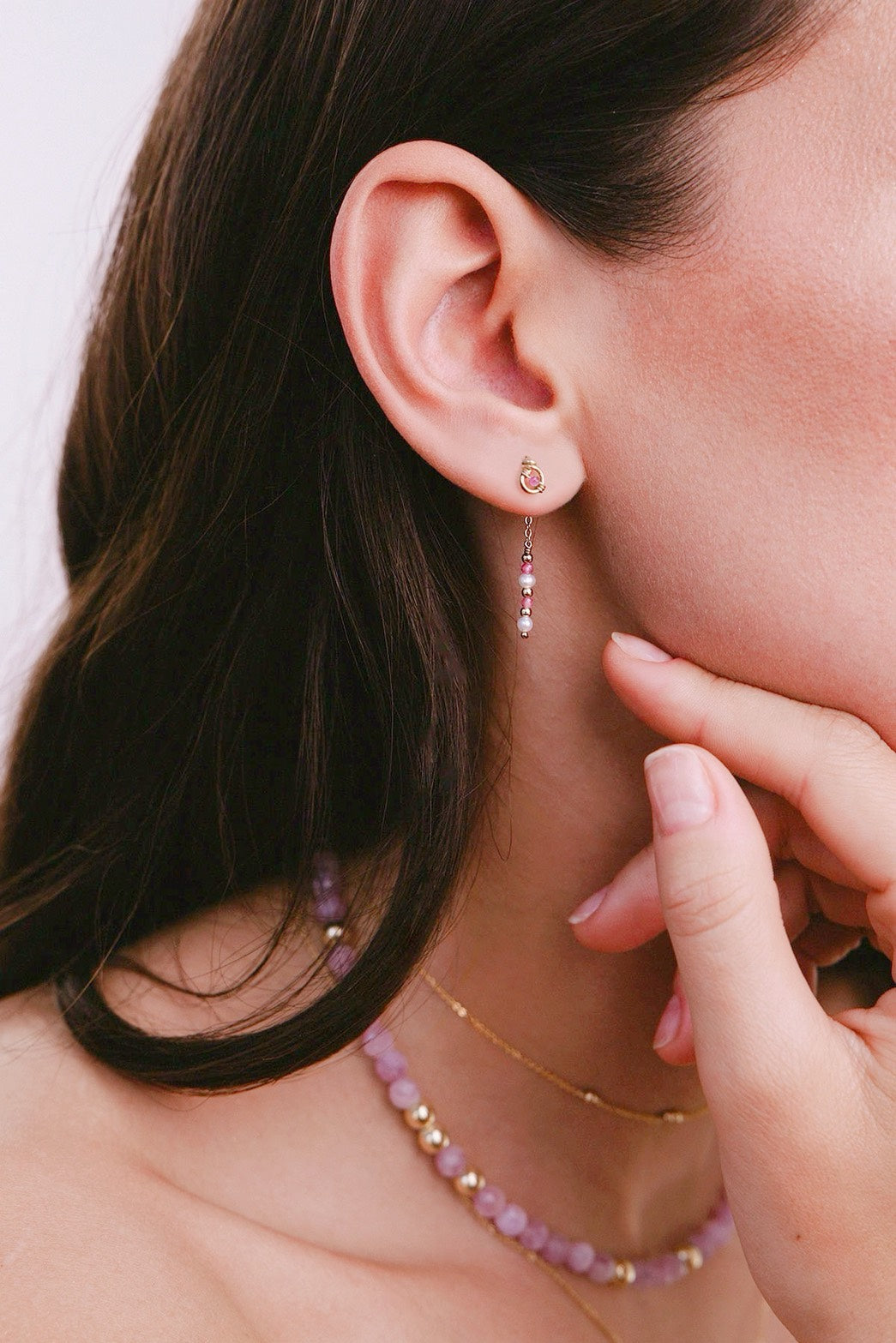 La version paire contient deux puces Pina et deux fermoirs Ella sertis de pierres aux couleurs d’Amarena, pour une harmonie lumineuse sur chaque oreille.