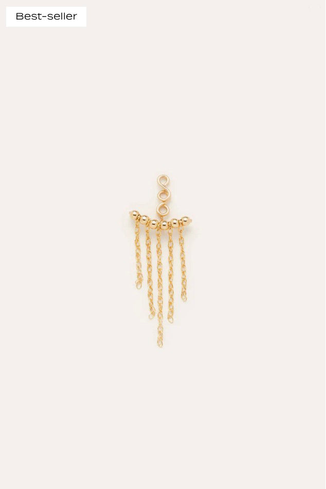 這款耳環背面飾有一排金鍊流蘇,簡約優雅。