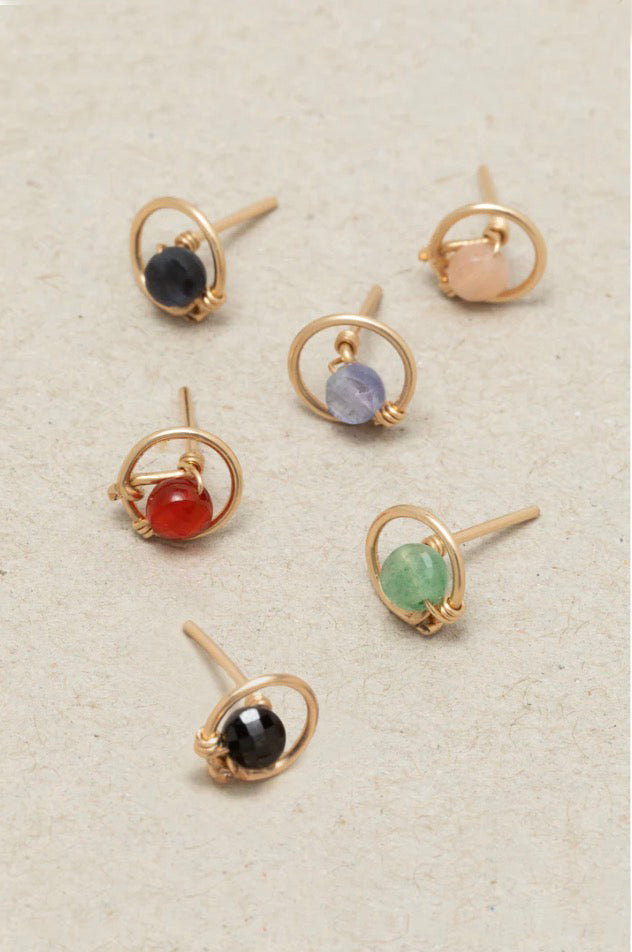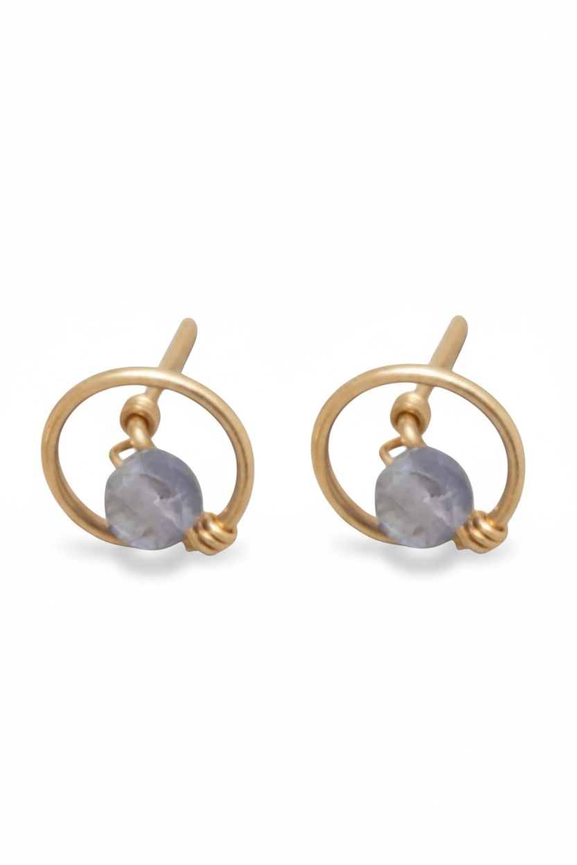 這款耳環將藍紫色的坦桑石與14K包金線結合,透過手工精鑲的技法呈現細緻的光感與線條。圓潤的寶石宛如宇宙中閃爍的星點,在髮絲輕揚間悄然綻放。