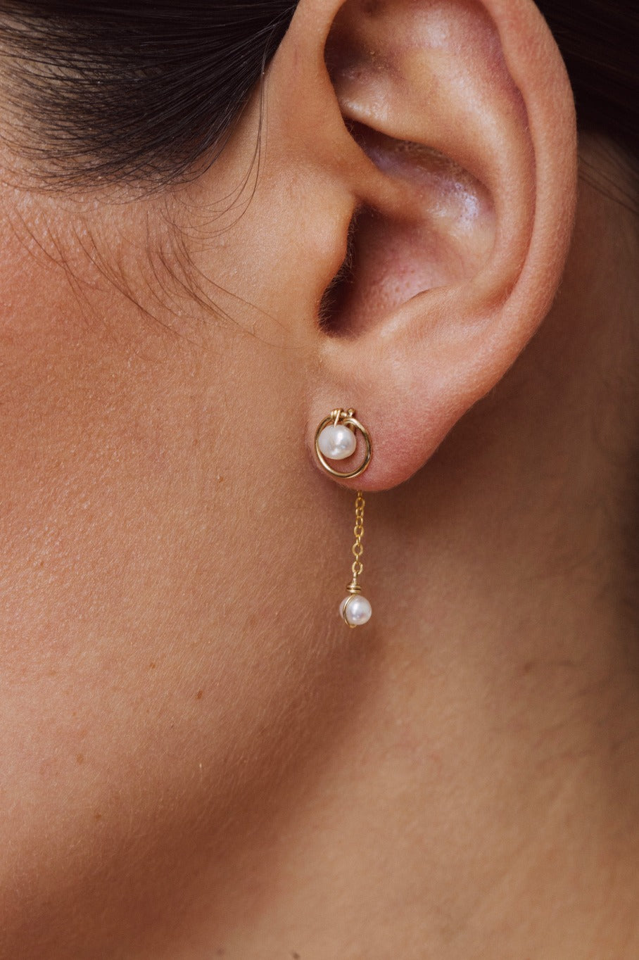 這款耳環將天然珍珠與14K包金線結合,透過手工精鑲的技法呈現細緻的光感與線條。圓潤的寶石宛如宇宙中閃爍的星點,在耳際間優雅搖曳,百搭珍珠是日常的搭配首選。